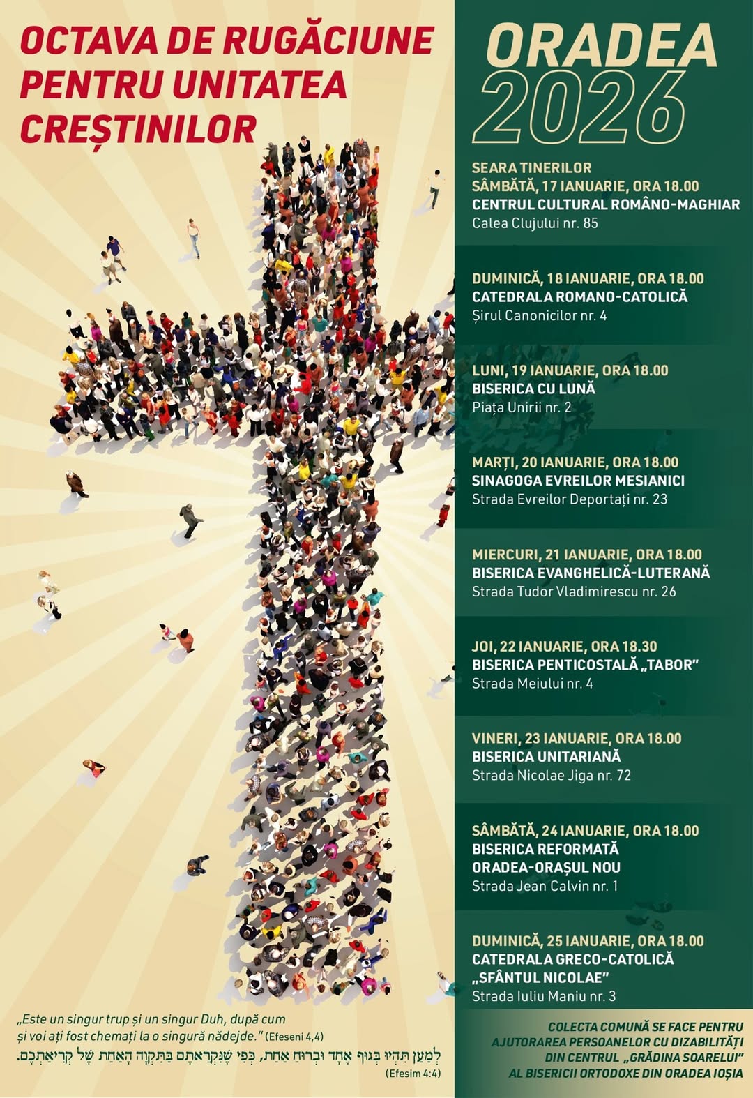 Oradea va găzdui, în perioada 17–25 ianuarie 2026, „Octava de rugăciune pentru unitatea creștinilor”, eveniment ecumenic anual care reunește comunități creștine și confesiuni diferite într-un spirit de rugăciune comună, dialog și mărturie fraternă.
