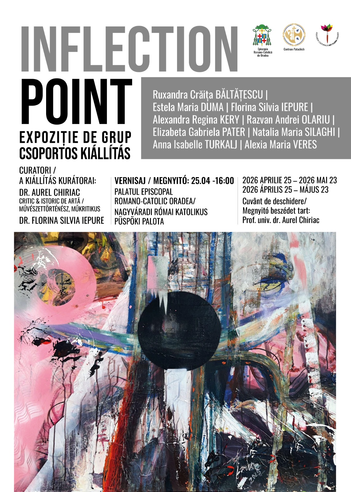 Palatul Episcopal Romano-Catolic din Oradea va găzdui, sâmbătă, 25 aprilie, la ora 16.00, vernisajul expoziției de artă vizuală „Inflexiunea Curbei”, peste 50 de lucrări realizate în tehnici variate: pictură de șevalet (acrilic, ulei), grafică, gravură intaglio, colaj, video-colaj, colaj digital și spray peste șablon.