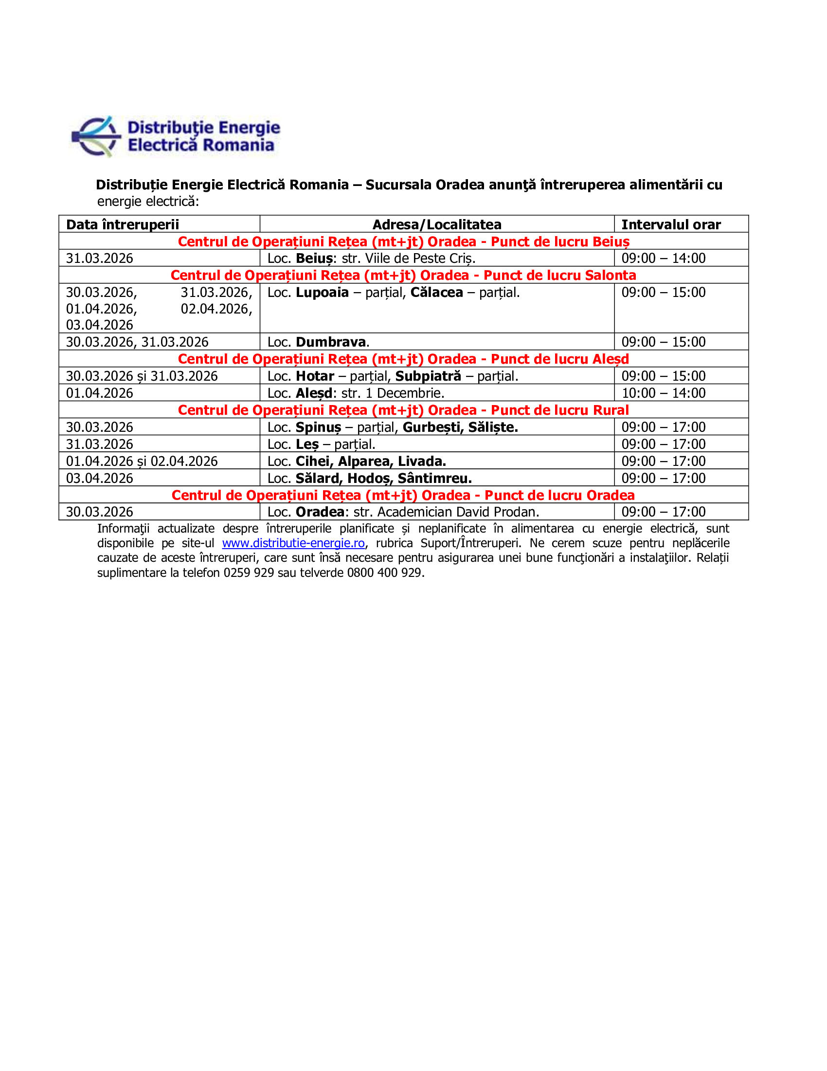 IEE 30.03.2026 - 03.04.2026 - PL Beius + PL Salonta + PL Alesd + PL Rural + PL Oradea