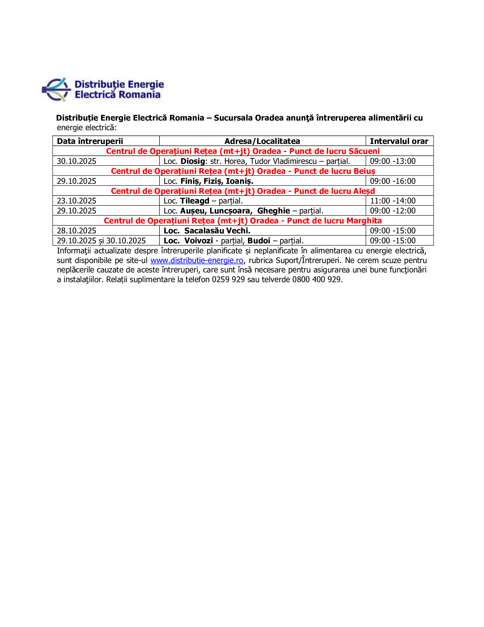 IEE perioada 23.10.2025 - 30.10.2025 - PL Sacueni + PL Beius + PL Alesd + PL Marghita