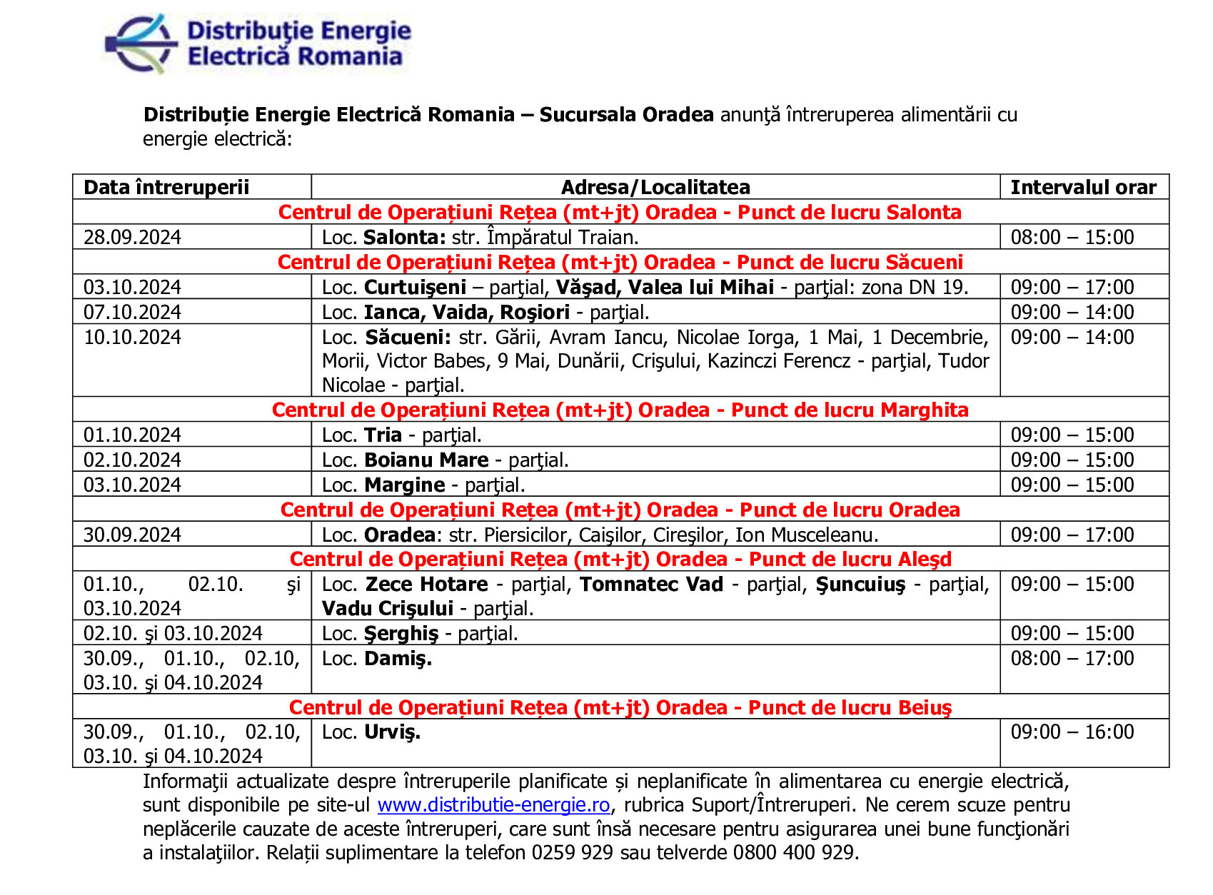 IEE perioada 28.09.2024 - 10.10.2024 - PL Salonta + PL Sacueni + PL Marghita + PL Oradea + PL Alesd + PL Beius