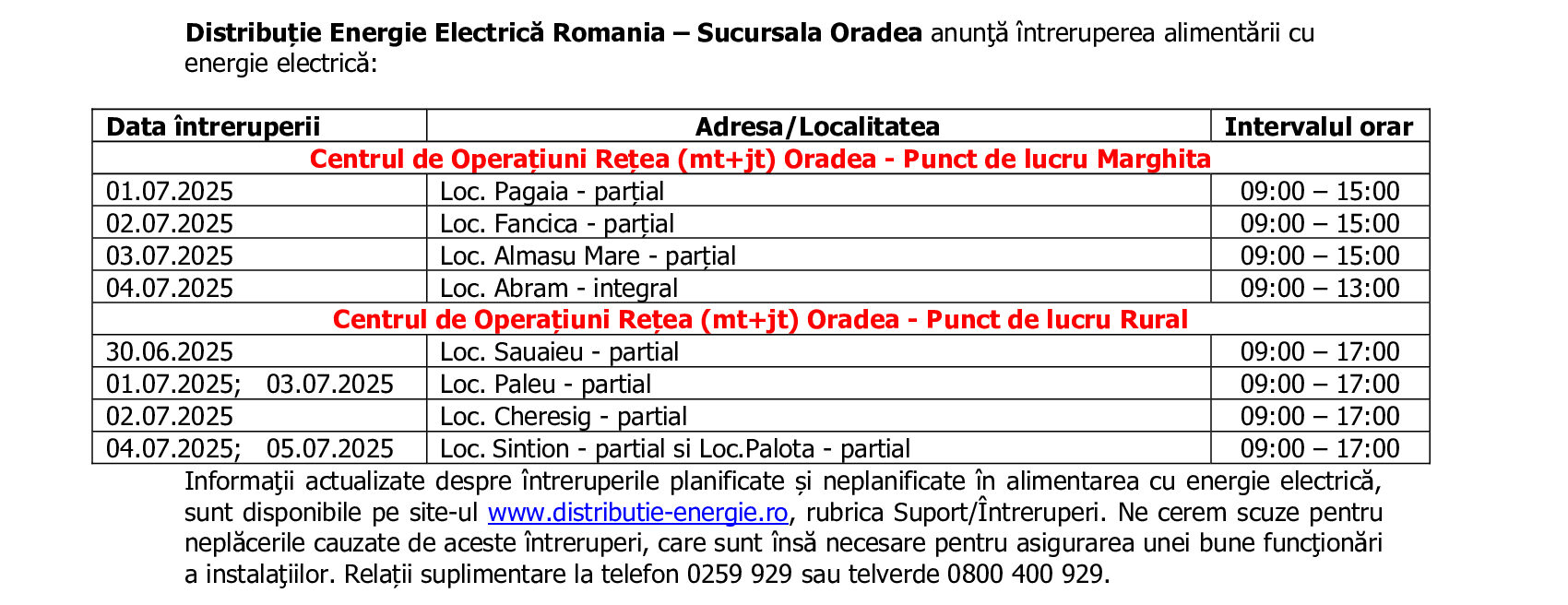 IEE perioada 30.06.2025 - 05.07.2025 - PL Marghita + PL Rural