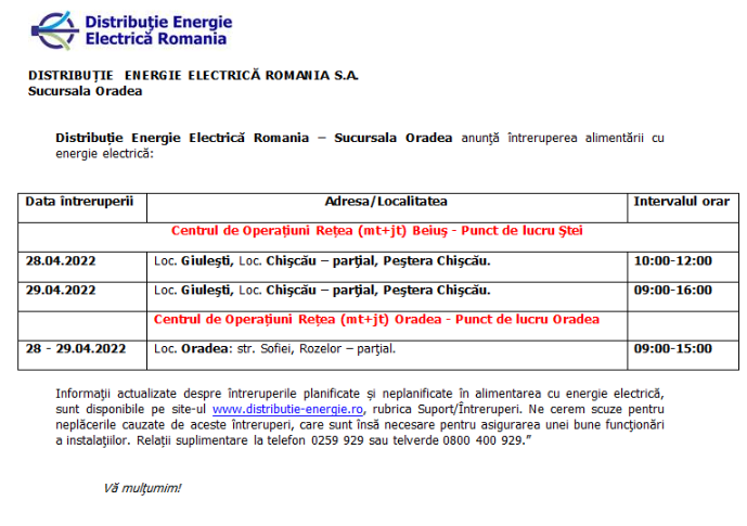 ÎNTRERUPERI ENERGIE ELECTRICĂ -Data 28.04.2022 - 29.04.2022 - PL Stei + PL Oradea