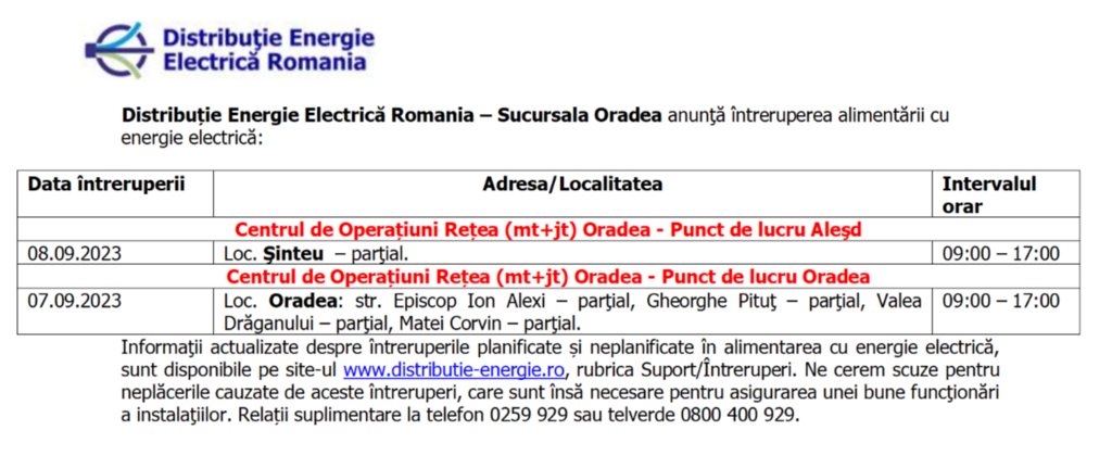 ÎNTRERUPERI ENERGIE ELECTRICĂ - IEE perioada 07.09.2023 - 08.09.2023_PL Alesd + PL Oradea