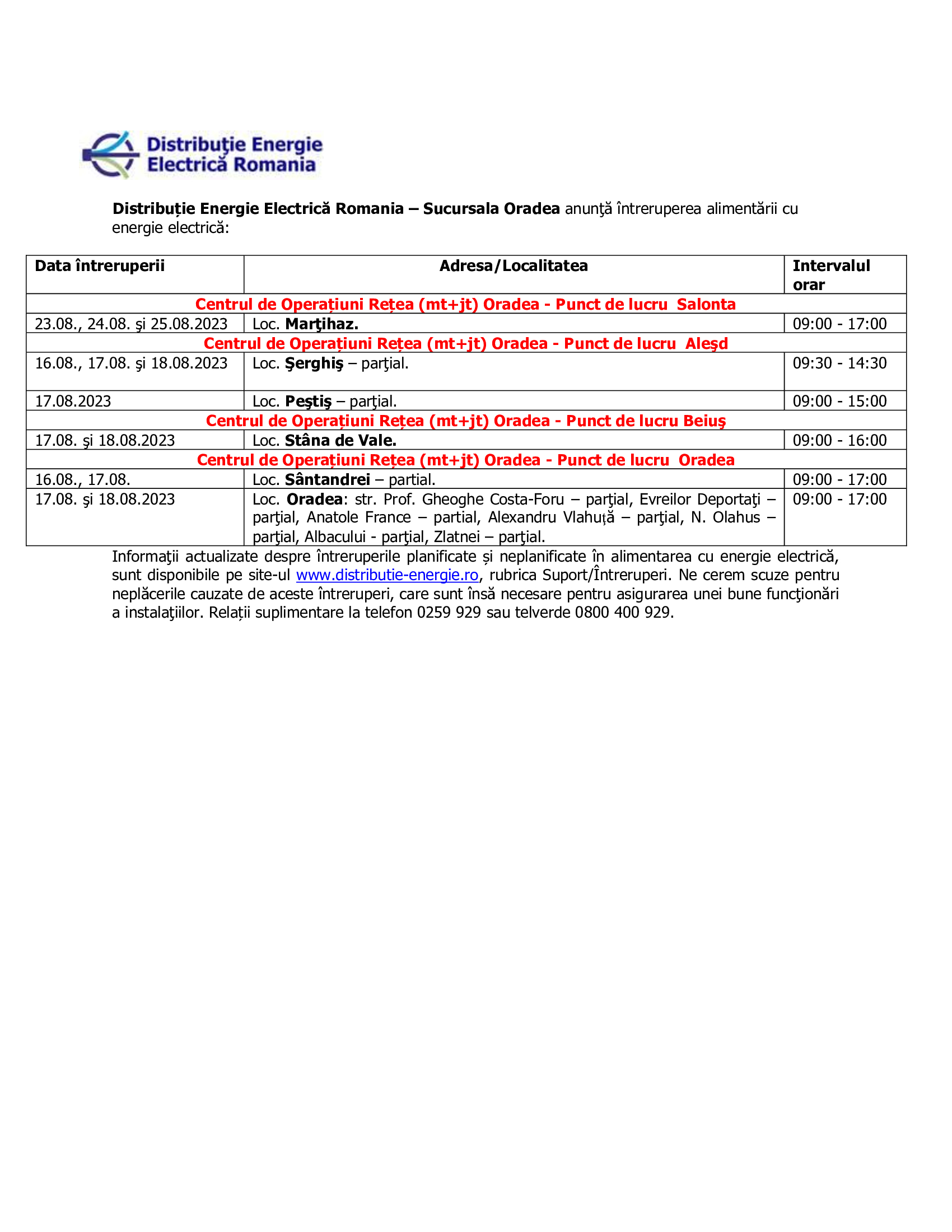 ÎNTRERUPERI ENERGIE ELECTRICĂ - IEE perioada 16.08.2023 - 25.08.2023 - PL Salonta + PL Alesd + PL Beius + PL Oradea