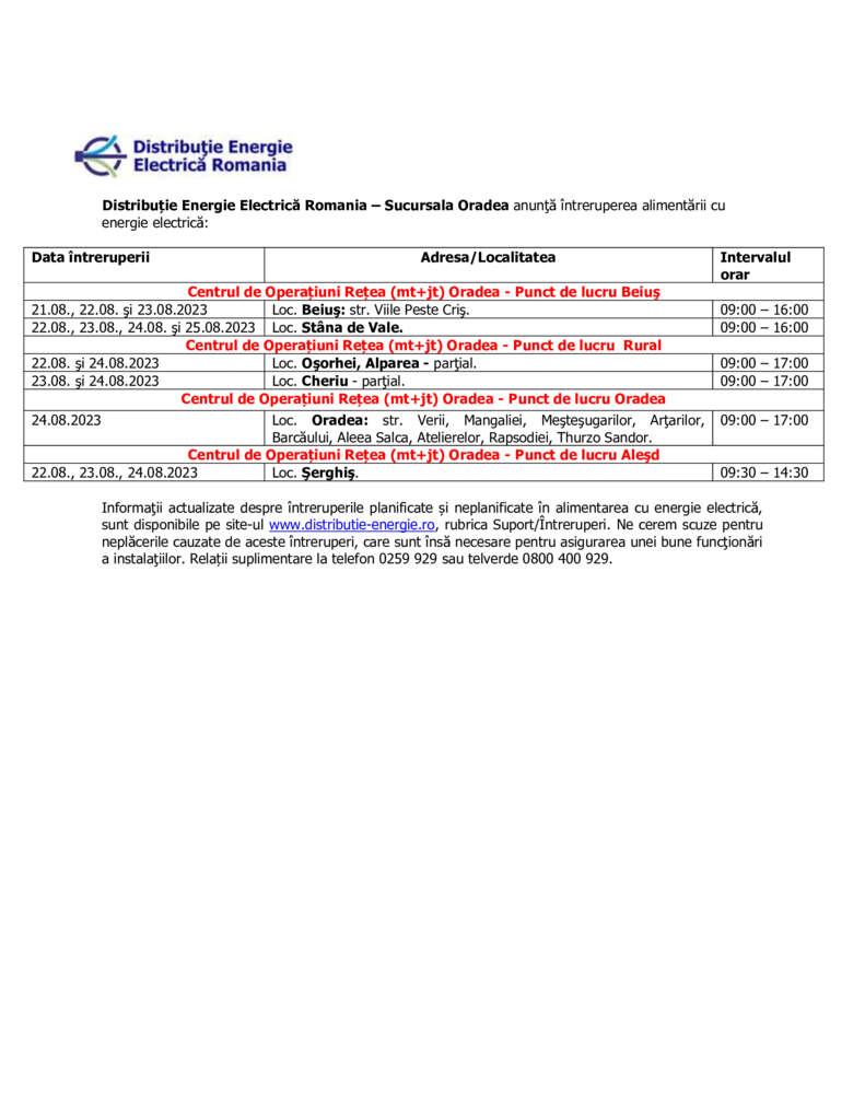 ÎNTRERUPERI ENERGIE ELECTRICĂ - IEE perioada 21.08.2023 - 25.08.2023 - PL Beius + PL Rural + PL Oradea + PL Alesd