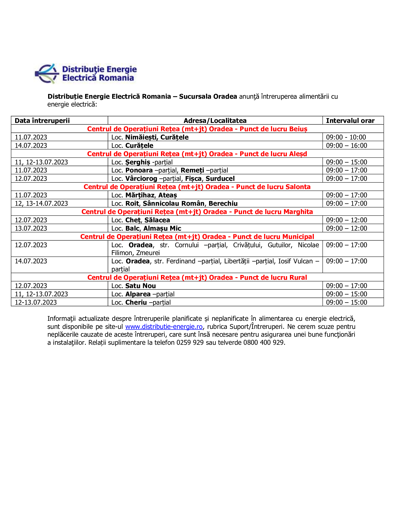 ÎNTRERUPERI ENERGIE ELECTRICĂ -Intreruperi EE 06.07.2023