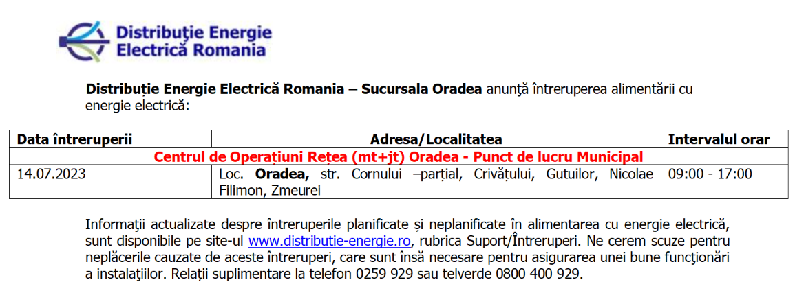 ÎNTRERUPERI ENERGIE ELECTRICĂ -Intreruperi EE 10.07.2023