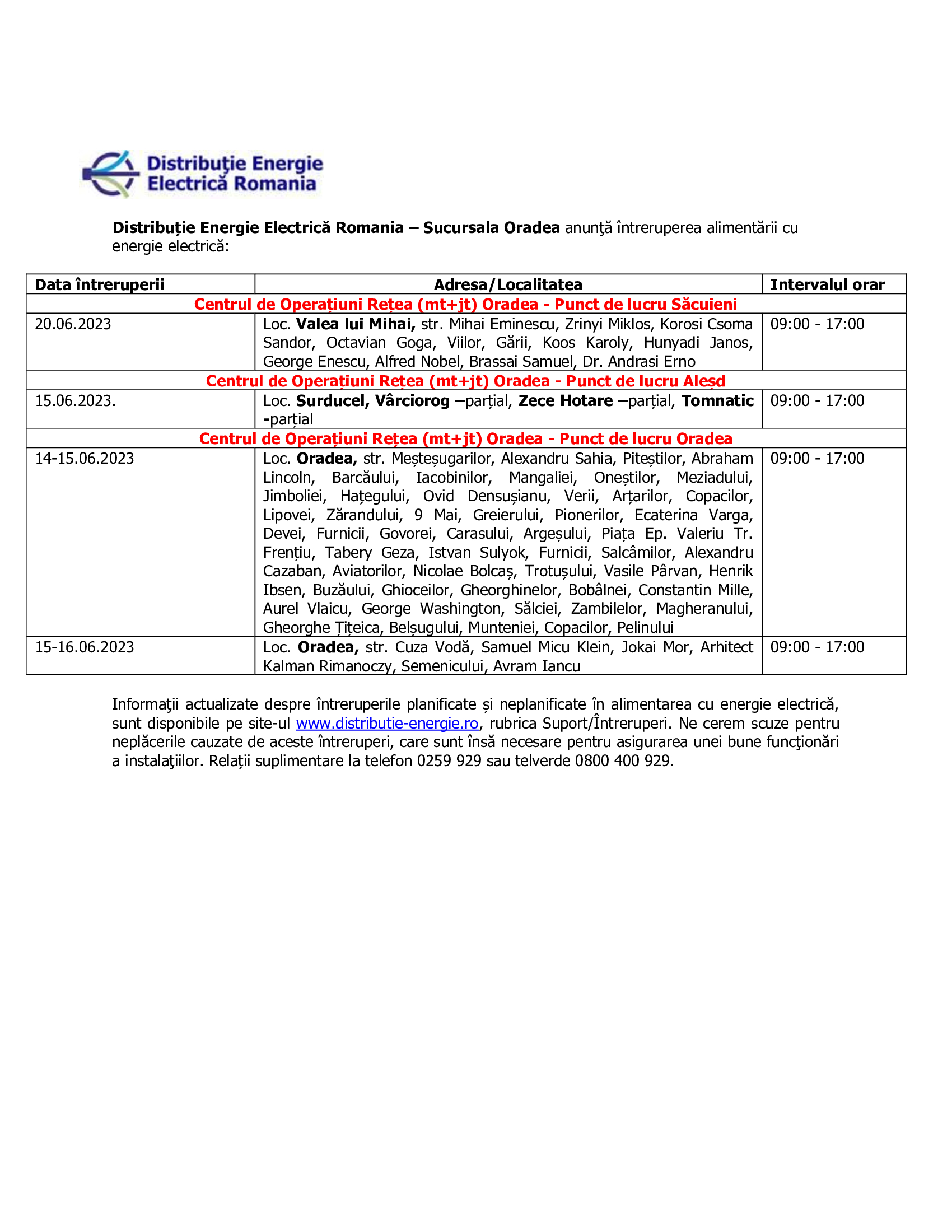 ÎNTRERUPERI ENERGIE ELECTRICĂ -Intreruperi EE 12.06.2023