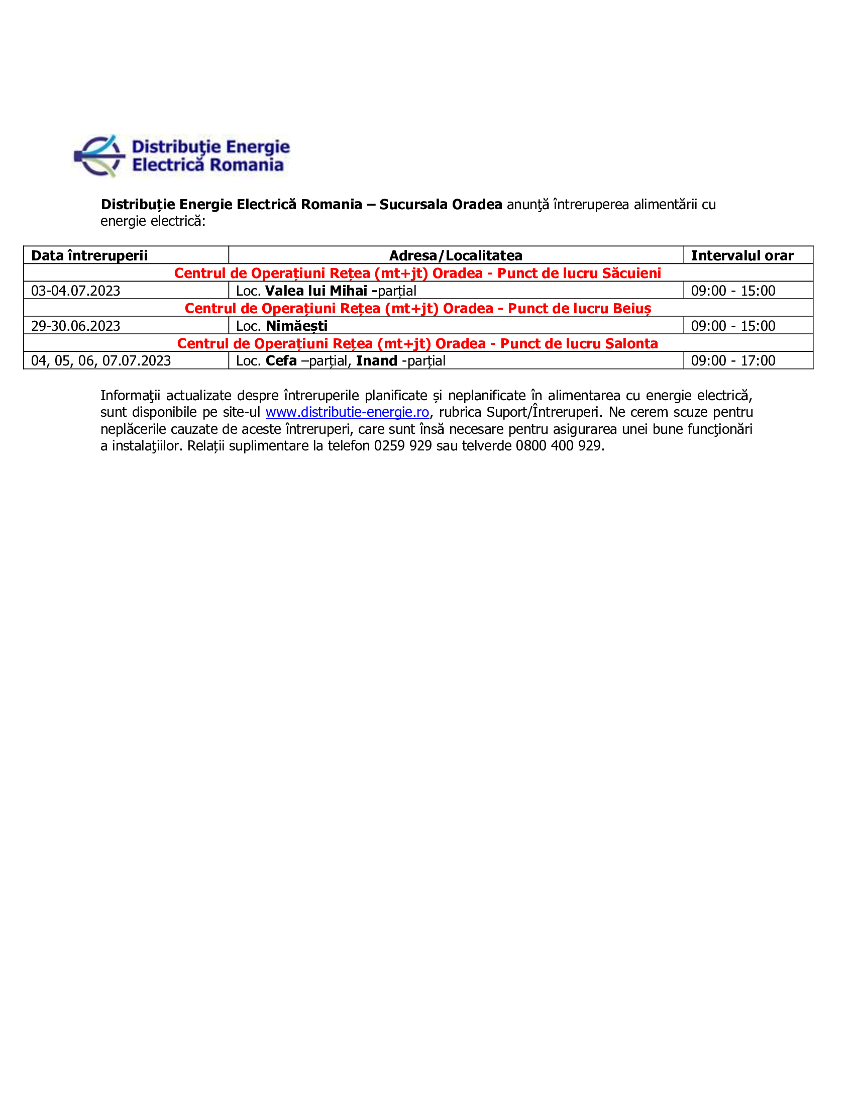 ÎNTRERUPERI ENERGIE ELECTRICĂ -Intreruperi EE 26.06.2023
