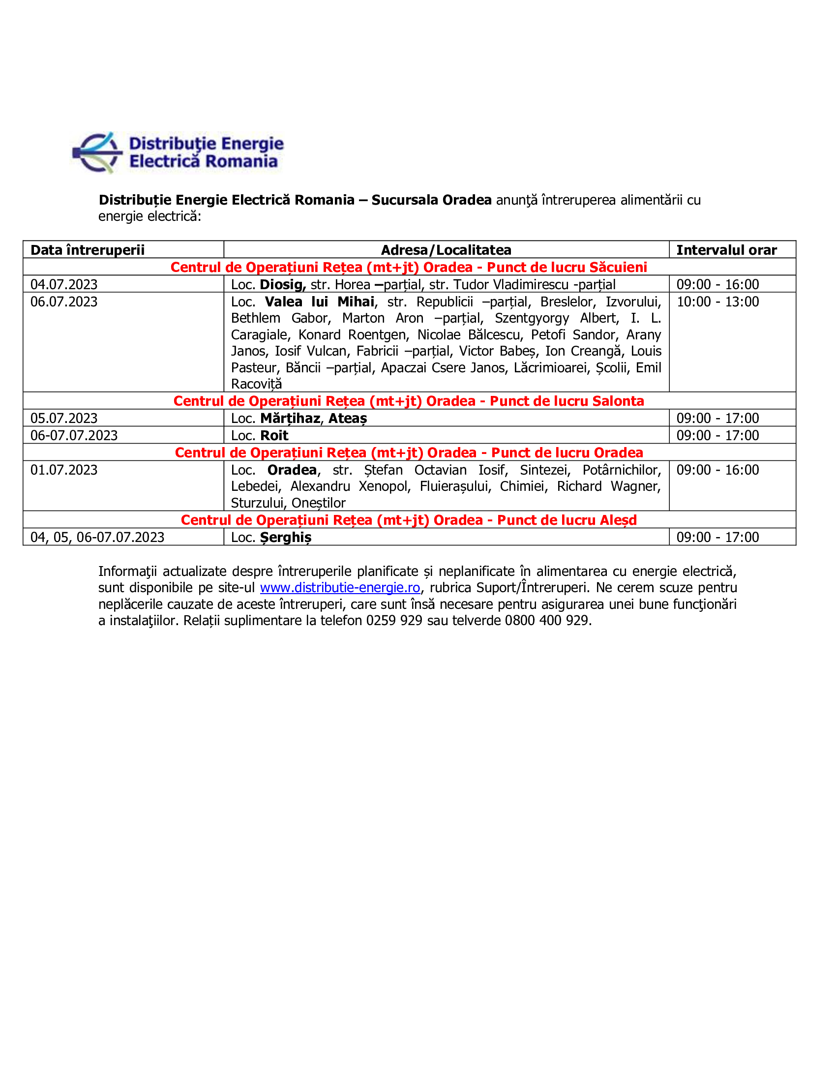 ÎNTRERUPERI ENERGIE ELECTRICĂ -Intreruperi EE 28.06.2023