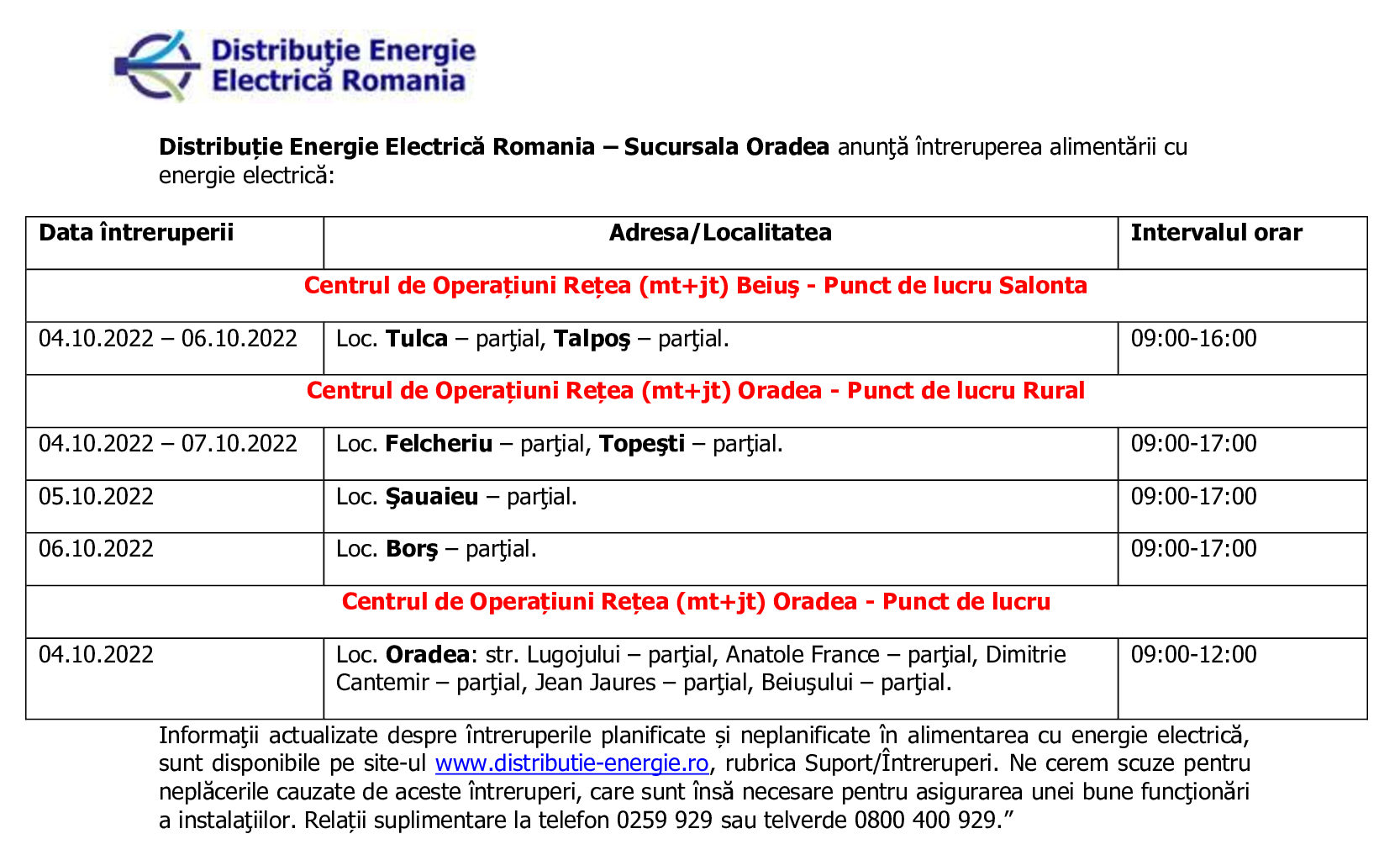 ÎNTRERUPERI ENERGIE ELECTRICĂ -Perioada 11.10.2022 -14.10.2022 - PL Alesd + PL Oradea + PL Rural