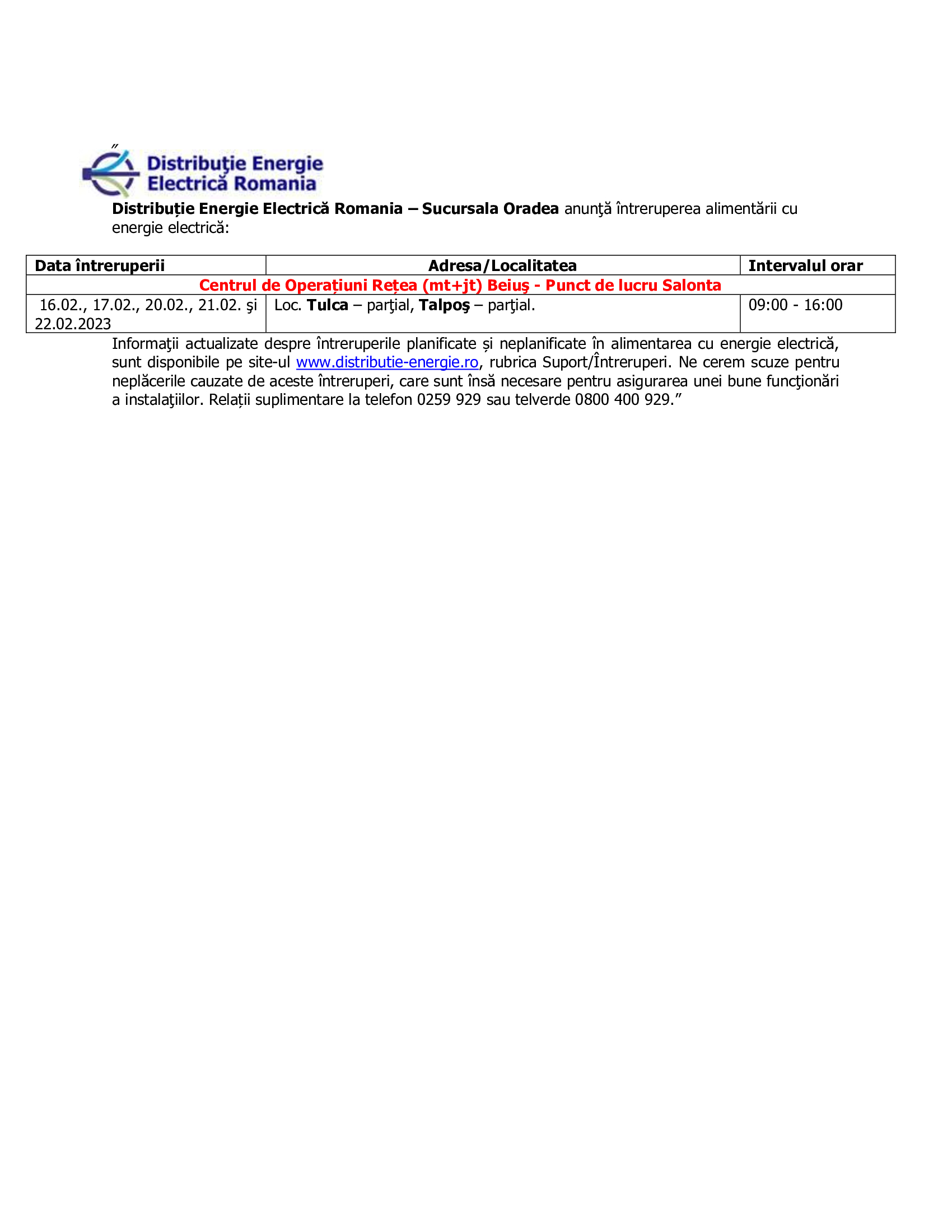 ÎNTRERUPERI ENERGIE ELECTRICĂ -Perioada 16.02.2023 - 22.02.2023 - PL Salonta