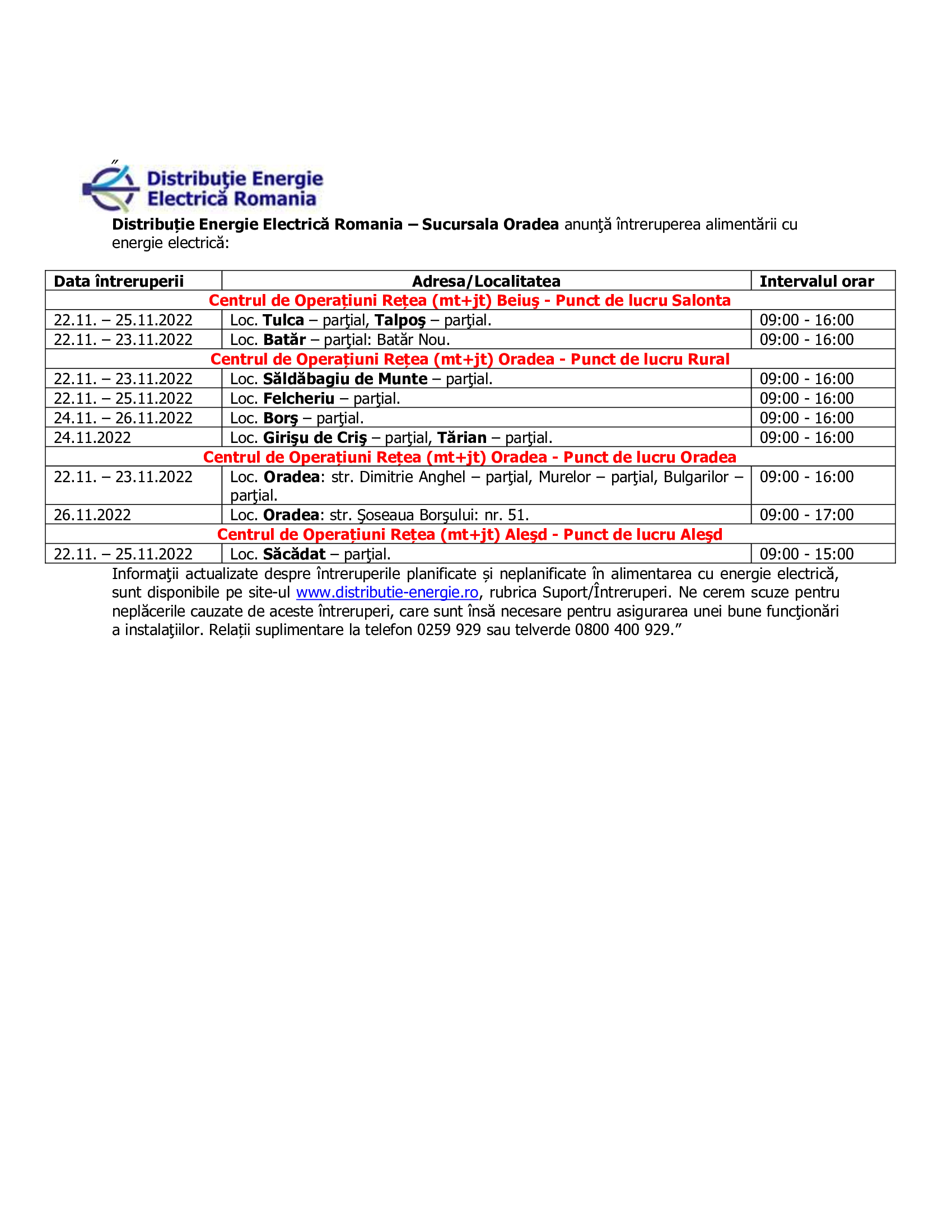 ÎNTRERUPERI ENERGIE ELECTRICĂ -Perioada 17.11.2022 - 23.11.2022 -Perioada 22.11.2022 - 26.11.2022 - PL Salonta + PL Rural + PL Oradea + PL Alesd