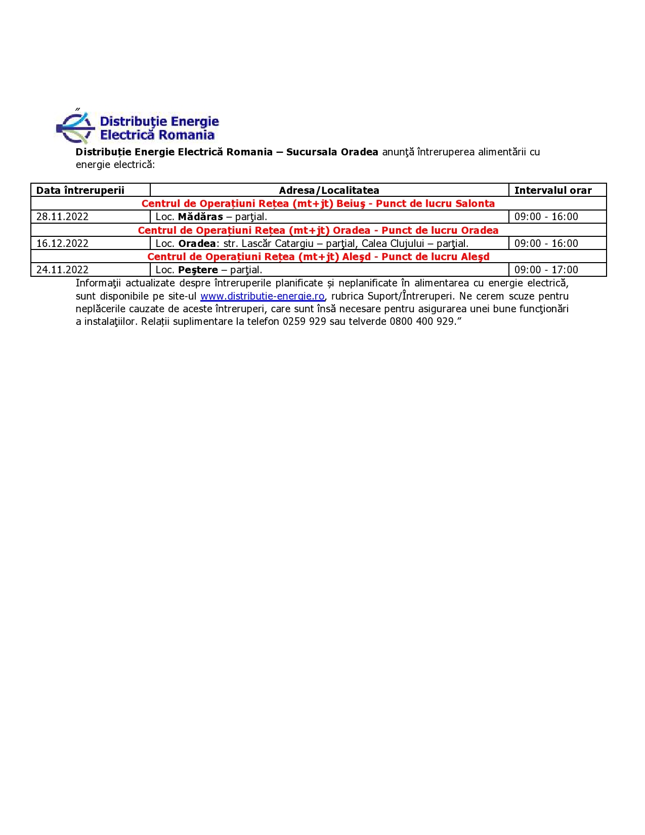 ÎNTRERUPERI ENERGIE ELECTRICĂ -Perioada 24.11.2022 - 16.12.2022 - PL Salonta + PL Oradea+PL Aleșd