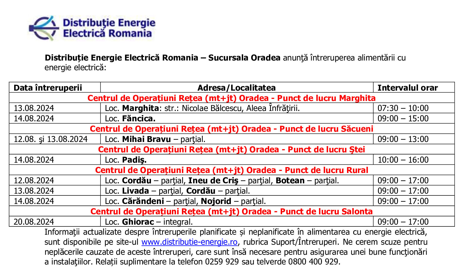 Titlul: IEE perioada 13.08.2024 - 20.08.2024 PL Marghita + PL Sacueni + PL Stei + PL Rural + PL Salonta