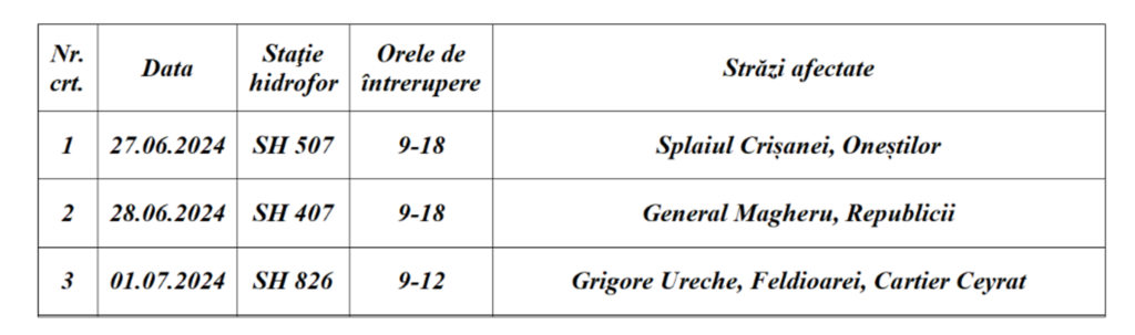 S.C.COMPANIA DE APĂ ORADEA S.A. anunţă consumatorii de apă potabilă alimentaţi prin staţiile de hidrofor SH507, SH407 și SH826 faptul că, în vederea reviziei tehnice a echipamentelor hidraulice, fiecare staţie de hidrofor va fi oprită după cum urmează: