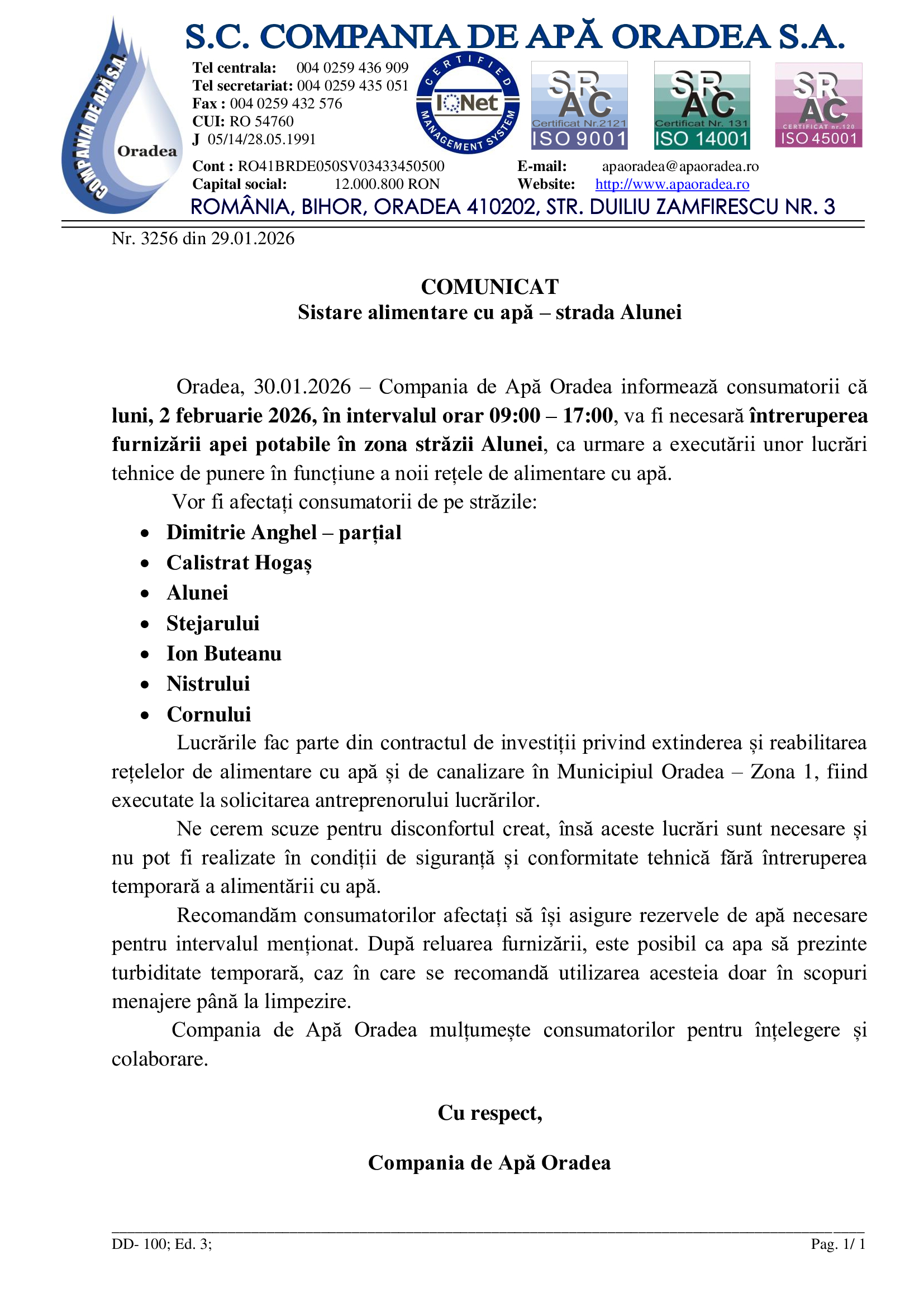 În dimineața zilei de 30 ianuarie, specialiștii pirotehnicieni ai ISU „Crișana” al județului Bihor au fost mobilizați pe strada Calea Aradului din Oradea, unde au desfășurat o misiune de asanare a teritoriului de muniția rămasă neexplodată.