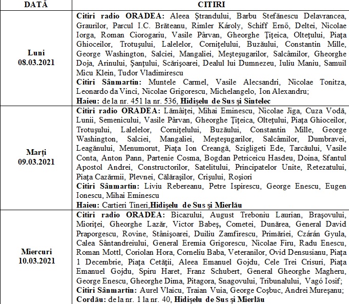 S.C. COMPANIA DE APĂ ORADEA S.A. îşi anunţă consumatorii că în vederea facturării consumurilor de apă rece pentru luna MARTIE 2021, citirea contoarelor de branşament se va face între orele 800 şi 1600 după următorul program: