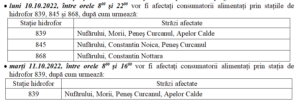 Rugăm consumatorii să îşi asigure rezervele de apă pentru acest interval de timp. Ne cerem scuze pentru inconvenientele provocate, iar în cazul în care la repunerea în funcţiune a serviciului de alimentare cu apă se observă deficienţe în parametrii de furnizare şi de calitate ai apei, vă rugăm să transmiteţi orice sesizare la Dispeceratul central al companiei, la numerele de telefon 0259 – 430.928 sau 0359 – 410.203.