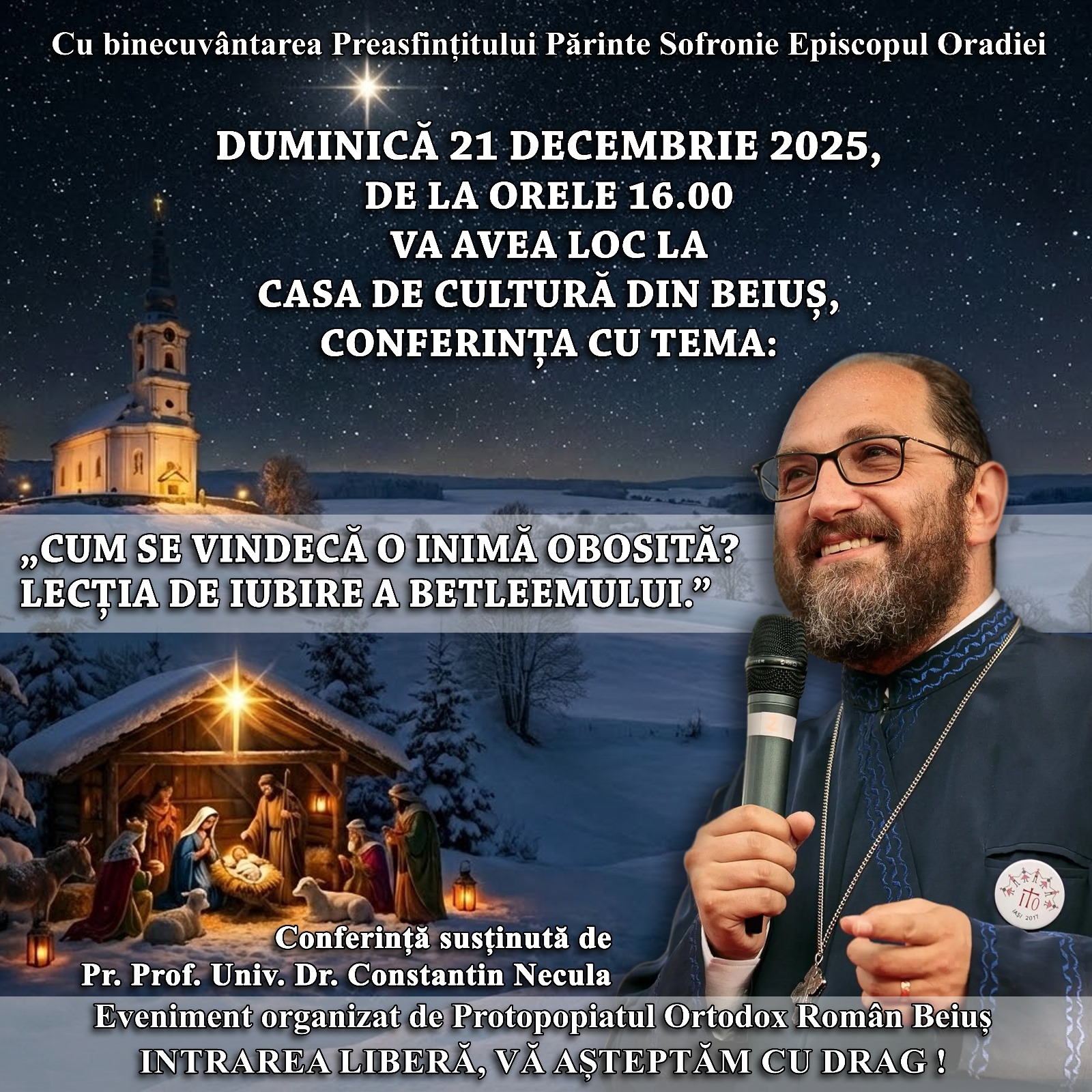 Episcopia Ortodoxă Română a Oradiei anunță organizarea a două evenimente prilejuite de prezența pr. prof. univ. dr. Constantin Necula în eparhie, în zilele de 20 și 21 decembrie, zile dedicate pregătirii lăuntrice pentru sărbătoarea Nașterii Domnului.