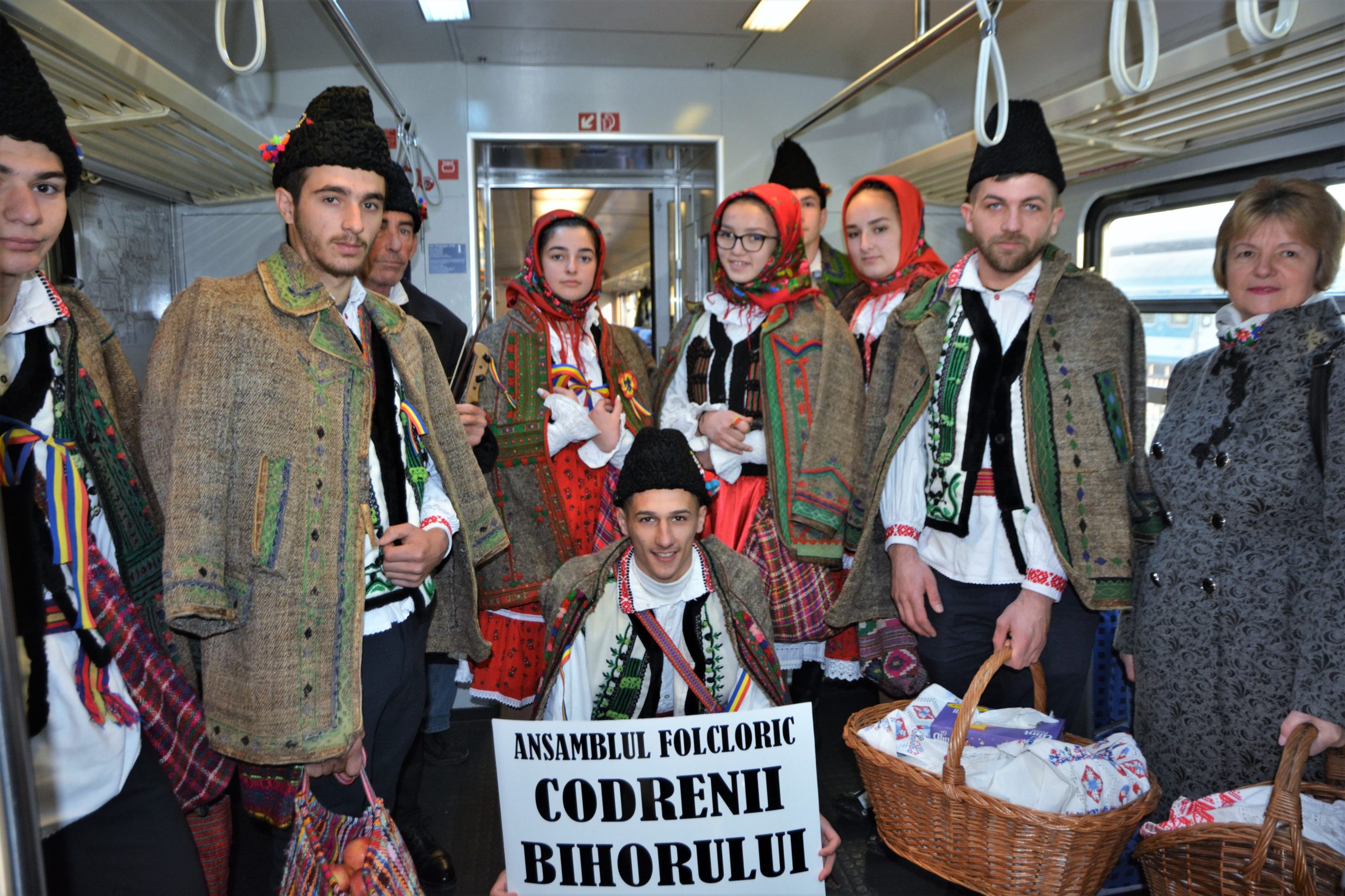 Membrii Ansamblului „Codrenii Bihorului” din Roşia au colindat călătorii trenului Oradea-Cluj Napoca