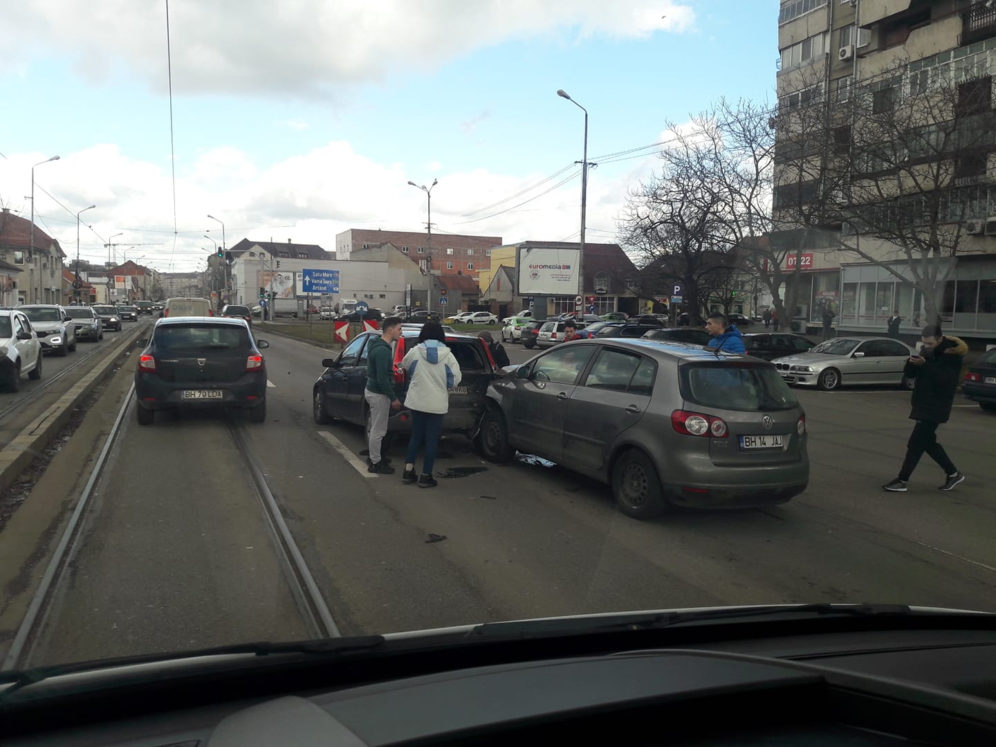 Patru mașini s-au tamponat, luni seara, pe Bulevardul Decebal din Oradea. Martorii au declarat că șoferul unui Hyundai a frânat târziu, astfel încât s-a urcat cu mașina peste un Audi, în apropierea intersecției străzii Tudor Vladimirescu cu Bulevardul Decebal.