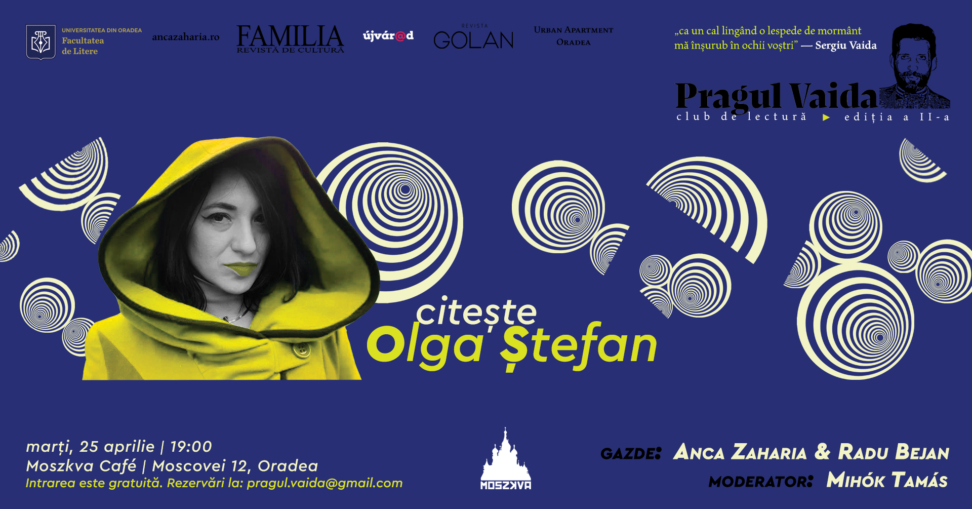 La a doua ediție a clubului de lectură Pragul Vaida va veni să citească poezie Olga Ştefan. Evenimentul va avea loc marţi, 25 aprilie, de la ora 19:00, în sala mare a cafenelei Moszkva de pe strada Moscovei, nr. 12. Gazde vor fi Anca Zaharia şi Radu Bejan, rolul de moderator revenindu-i lui Mihok Tamas.