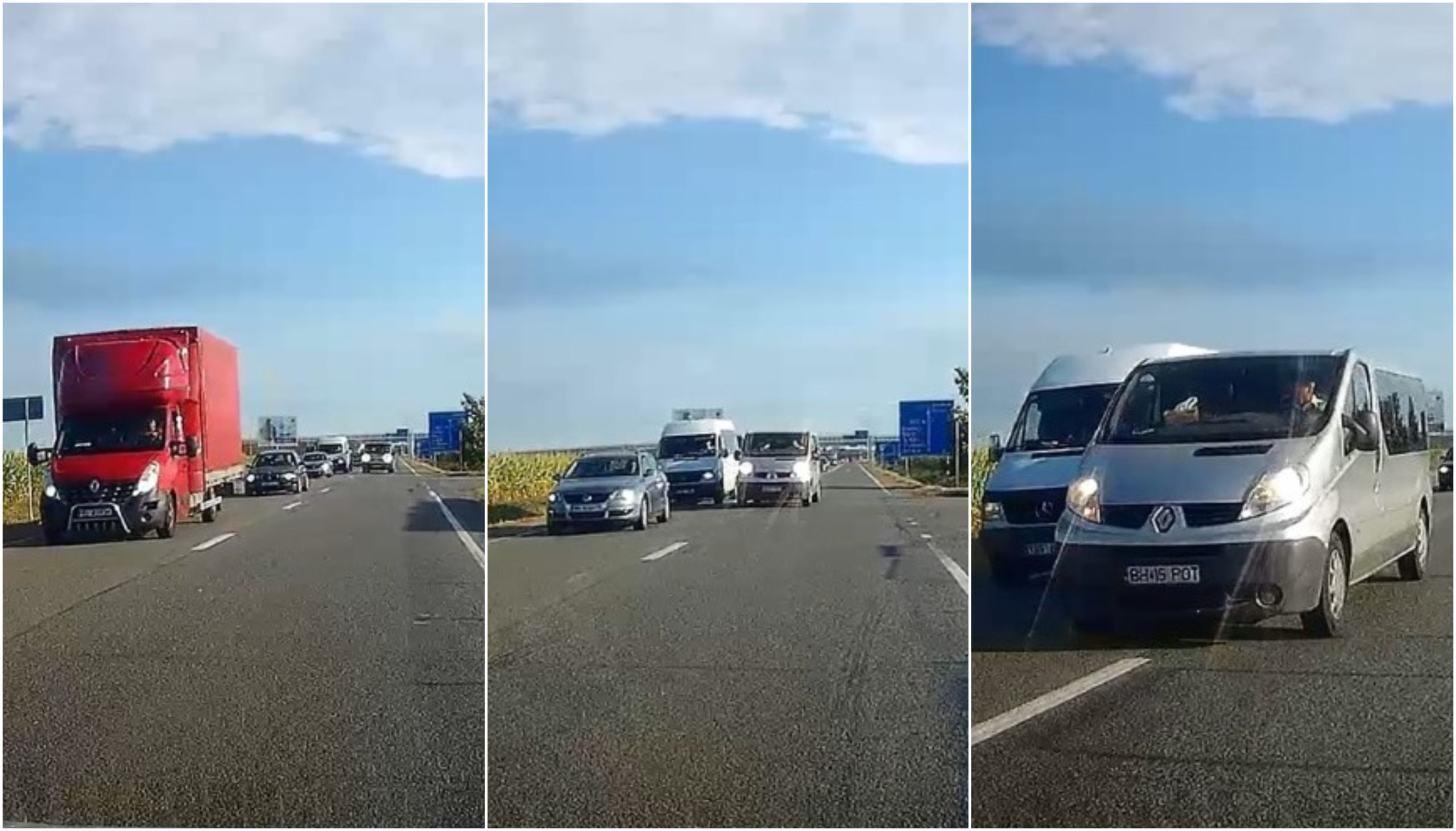 Depășire kamikaze, filmată de o cameră de bord: Șoferul a vrut să depășească două camioane, în curbă