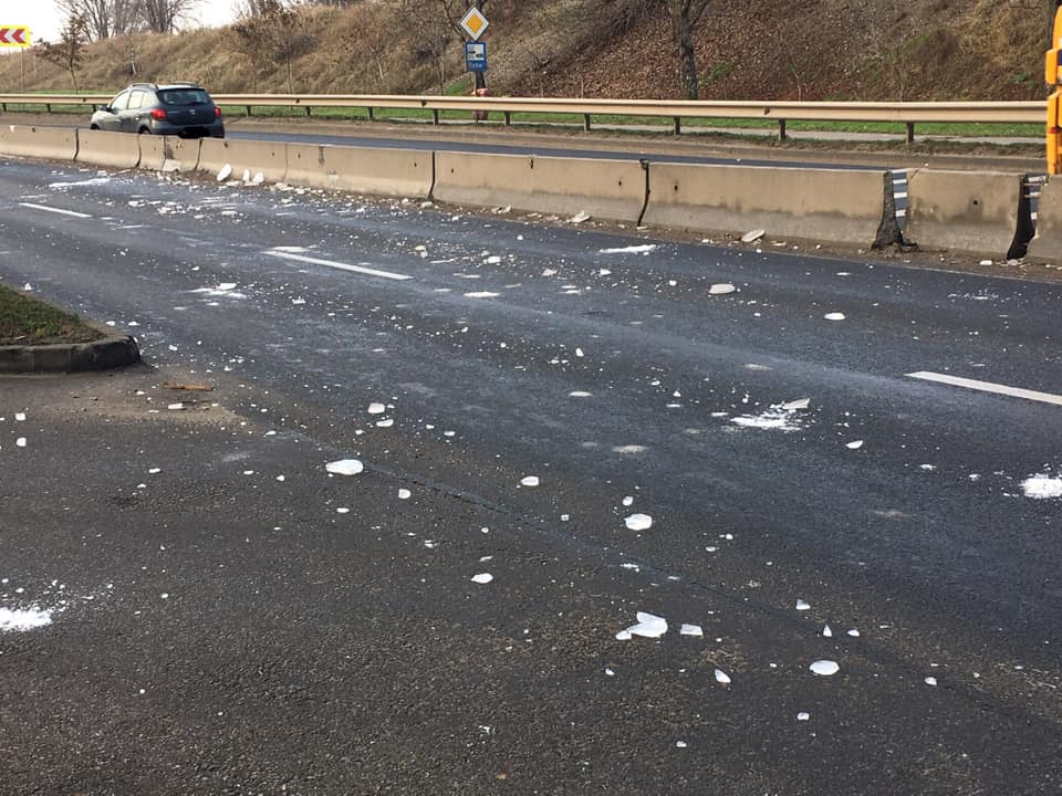 Pericol de accidente pe Centura Oradea! Mai multe bucăți mari de gheață s-au desprins de pe camioane