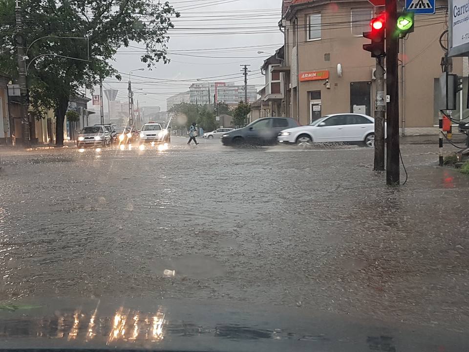 În zece minute de ploaie torenţială, canalizarea Oradiei a defulat, umplând străzile de apă neagră.