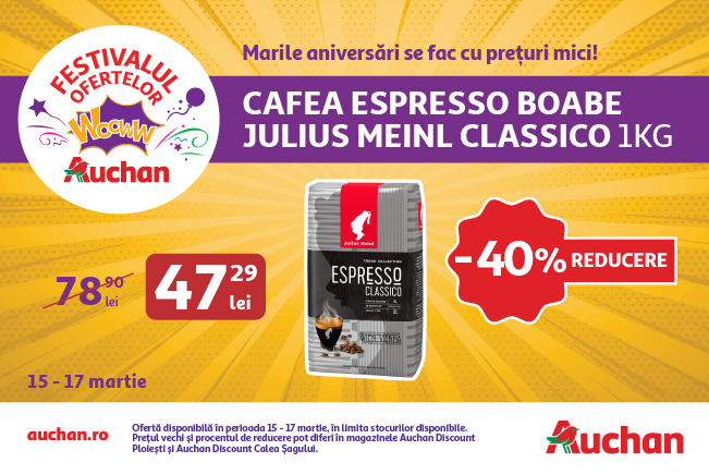 Până pe 2 aprilie, în toate magazinele Auchan din țară și online, pe auchan.ro, Festivalul Ofertelor Wooww îți aduce mega reduceri de până la 50%, indiferent dacă ai sau nu card de fidelitate MyCLUB Auchan. Cardul de fidelitate îți oferă însă extra beneficii, acces la tombolă și oferte la și mai multe produse.