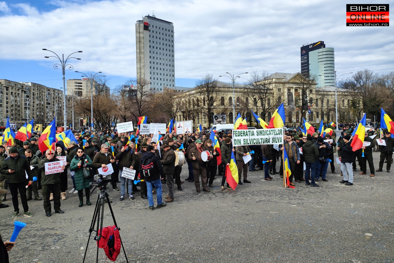 Sute de silvicultori s-au adunat miercuri, 19 martie, în Piața Victoriei din București, pentru a organiza un miting împotriva măsurilor guvernamentale care le afectează grav drepturile și veniturile. Printre participanți se numără și 35 de silvicultori din Bihor.
