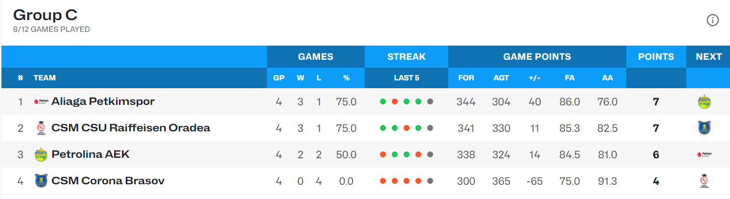 În celălalt meci din Grupa C, CSM Corona Brașov – Aliaga Petkimspor Izmir 73-97.