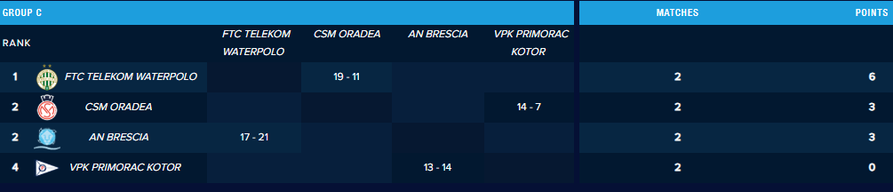 După două etape, atât CSM Oradea, cât și AN Brescia au câte o victorie cu VPK Primorac Kotor, ultima clasată, și o înfrângere cu liderul Ferencvaros TC Telekom Budapesta.