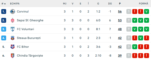 Bihorenii au moralul bun după victoria consistentă obținută sub Turnul Chindiei, scor 3-1, în timp ce steliștii au pierdut cu 0-2 pe terenul lui Sepsi Sfântu Gheorghe.