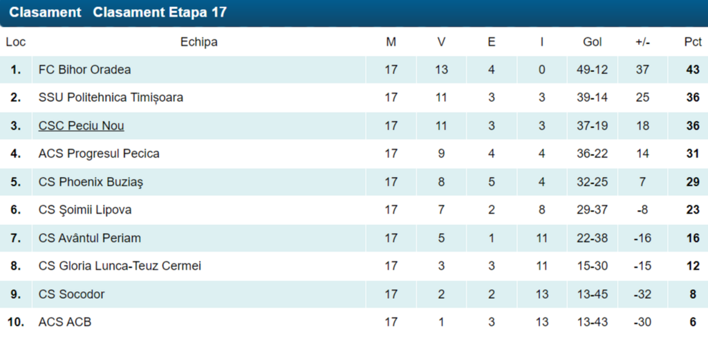 CSC Peciu Nou – Şoimii Lipova 4-2 (1-0). Marco Enciu 24, 68, Denis Bud 58, Ioan Mera 72 / Cătălin Dinu 77, 80
