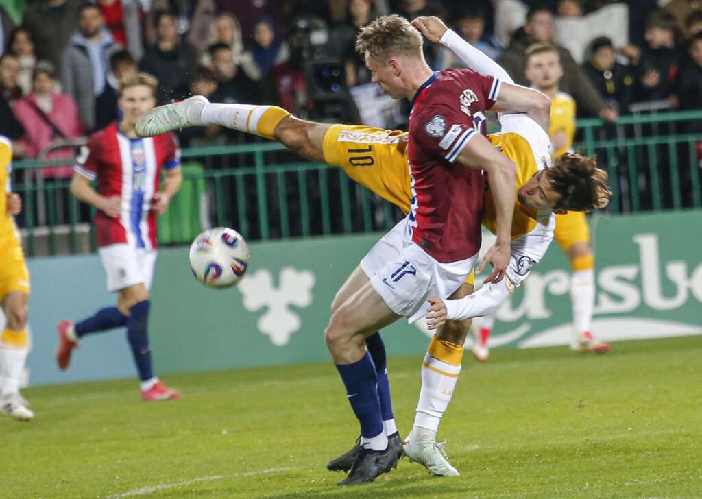 Alexandru Boiciuc (nr. 10, în galben) în duel cu Torbjorn Heggem în meciul Moldova – Norvegia jucat în 22 martie 2025. FOTO: EPA/DUMITRU DORU