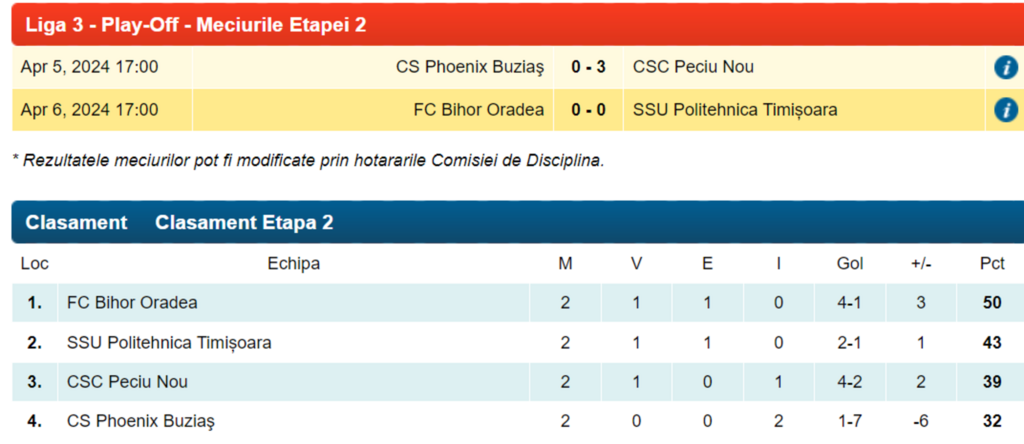 Etapa viitoare (sâmbătă 13 aprilie, ora 17:00): CSC Peciu Nou – FC Bihor Oradea, Politehnica Timișoara – Phoenix Buziaș.