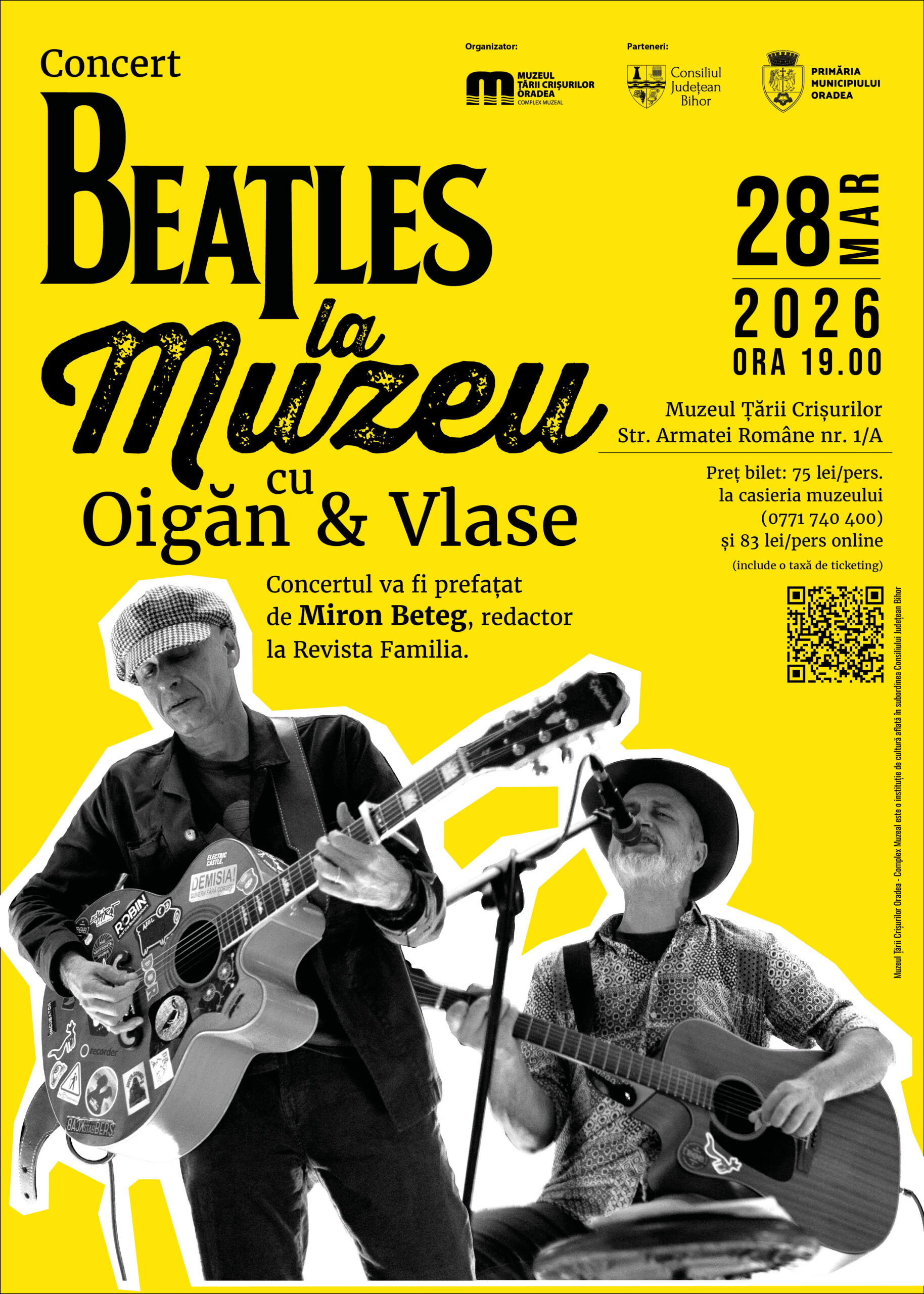 Muzeul Țării Crișurilor Oradea – Complex Muzeal organizează concertul „Beatles la Muzeu – cu Oigăn şi Vlase”. Evenimentul va avea loc sâmbătă, 28 martie, de la ora 19.00, la sediul Muzeului Țării Crișurilor (Str. Armatei Române nr. 1/A), Sala de conferințe.