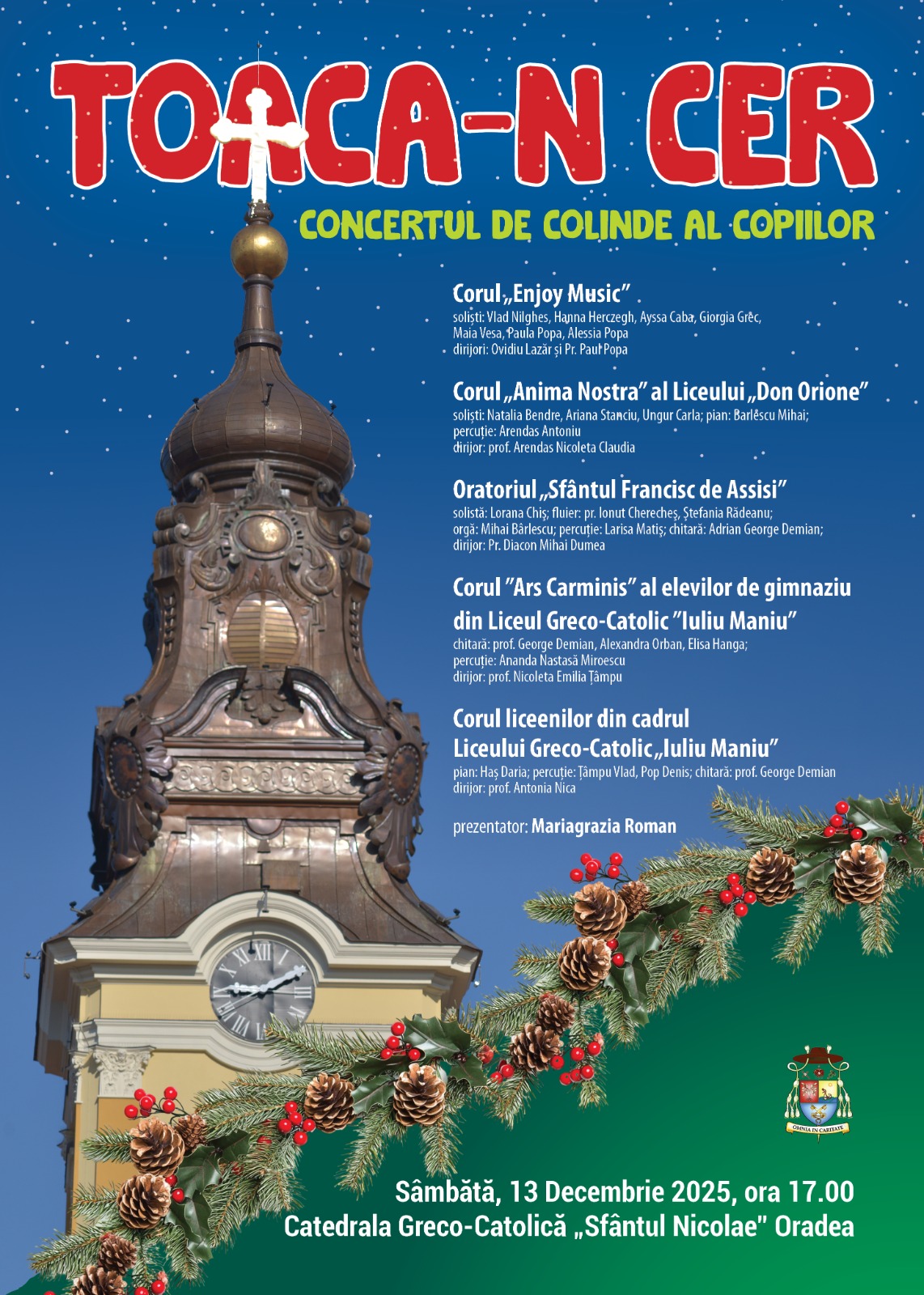 Catedrala Greco-Catolică „Sfântul Nicolae” din Oradea va găzdui sâmbătă, 13 decembrie, de la ora 17:00, concertul anual de colinde al copiilor, intitulat „Toaca-n cer”.