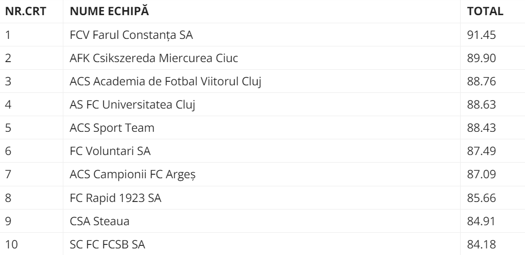Pe primul loc se situează Farul Constanța – 91,45 de puncte, dobrogenii fiind urmați pe podium de AFK Csikszereda Miercurea Ciuc – 89,90 puncte și ACS Academia de Fotbal Viitorul Cluj – 88,76 puncte.