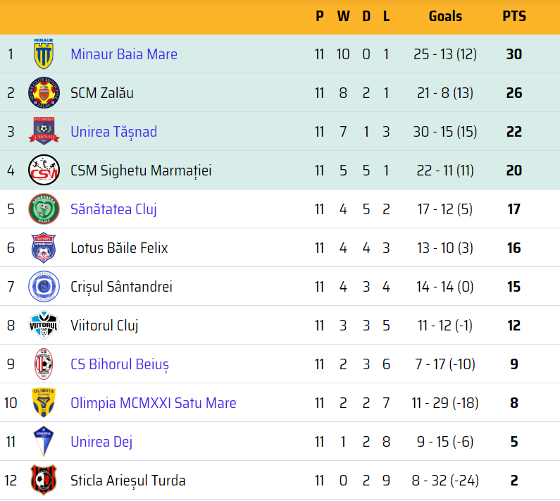 Un loc mai jos în clasament este Crișul Sântandrei cu 15 puncte, care vine după o serie de 3 jocuri în care nu a câștigat, două înfrângeri și un egal. Sâmbătă, de la ora 14:00, echipa Sântandreiului va juca din nou pe teren propriu cu ultima clasată Sticla Arieșul Turda.