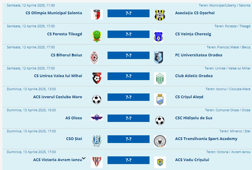 ACS Oșorhei – AS Olcea 5-0 (1-0). Andrei Ferik 45, 90+2, Adrian Ungur 64, 72, 77