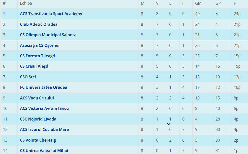 Etapa viitoare (25-26 octombrie): sâmbătă, Olimpia Salonta – ACS Transilvania Sport Academy (ora 11:00), CS Oșorhei – Izvorul Cociuba Mare (ora 11:00, teren Alparea), Club Atletic Oradea – Crișul Aleșd (ora 11:00), CSC Nojorid Livada – CSO Ștei (ora 11:00), Foresta Tileagd – FC Universitatea Oradea (ora 15:00); duminică, Voința Cheresig – Unirea Valea lui Mihai (ora 15:00), Victoria Avram Iancu – ACS Vadu Crișului (ora 15:00).