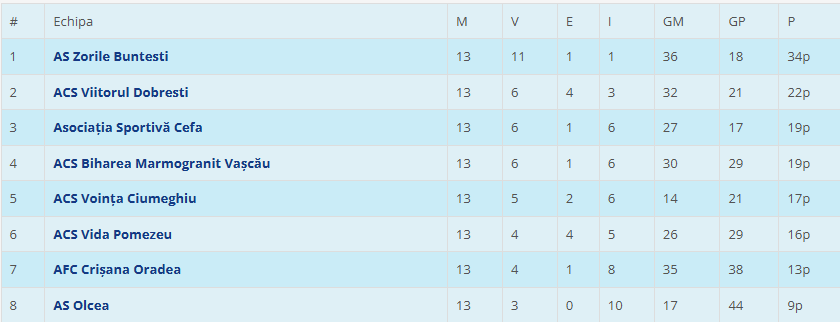 Etapa viitoare (duminică, 30 noiembrie, ora 14:00): Vida Pomezeu – AS Cefa, AS Olcea – AFC Crișana Oradea, Viitorul Dobrești – Biharea Vașcău, Zorile Buntești – Voința Ciumeghiu.