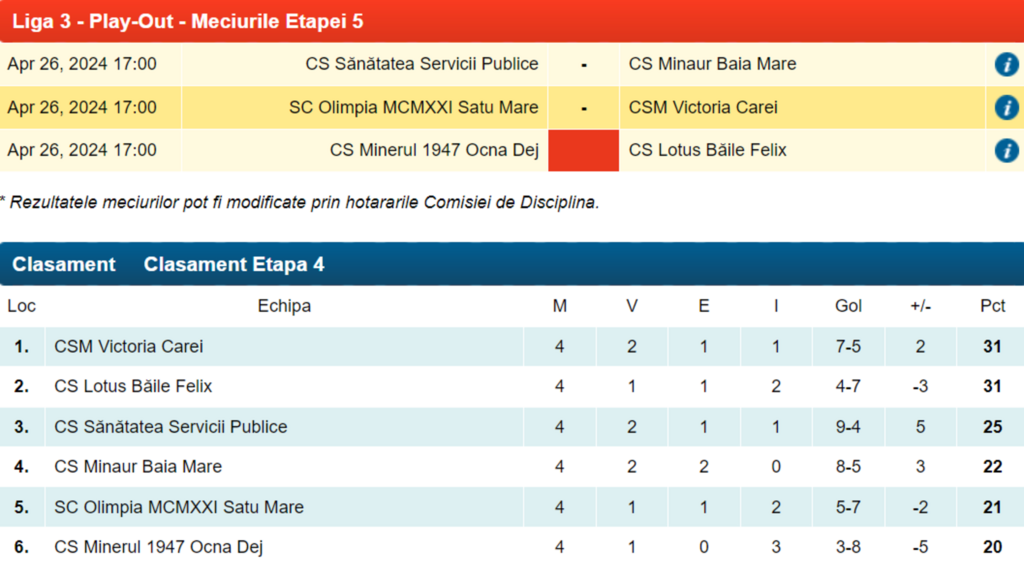 Minerul Ocna Dej ocupa ultimul loc în Seria 10 cu 20 de puncte, două mai puțin față de primul loc ce asigura menținerea în Liga 3.