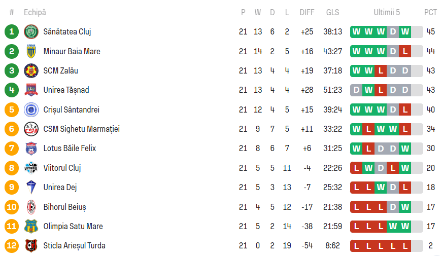 Sticla Arieșul Turda – Unirea Tășnad 0-3 (la masa verde, echipa din Turda a fost exclusă din campionat).