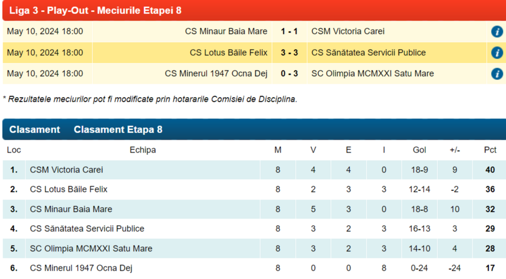 Minaur Baia Mare – Victoria Carei 1-1 (0-0). Tiberiu Serediuc 48 / Andrei Hosu 81