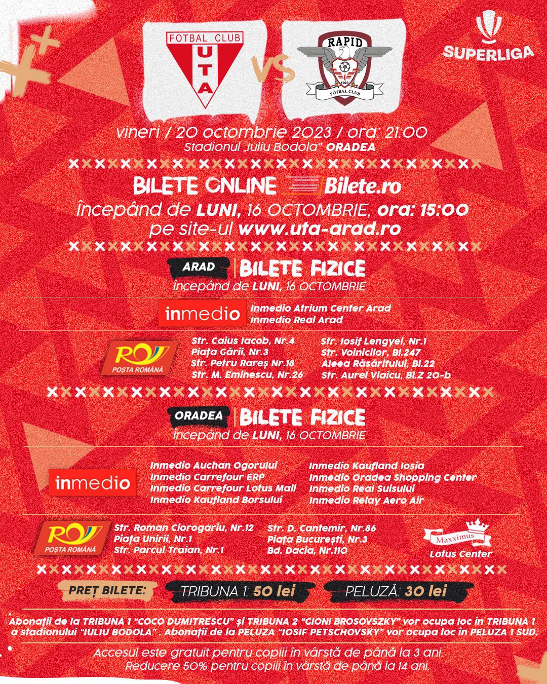 „Tichetele pentru UTA – Rapid București, vor fi disponibile de luni, 16 octombrie, ora 15:00. Biletele se vor găsi online pe uta-arad.ro, secțiunea ticketing. Acestea se vor găsi și în magazinele inMedio partenere din Arad și Oradea, la Oficile Poștale din Arad și Oradea, precum și magazinul Maxximus din Lotus Center Oradea. Biletele la Tribuna 1 vor costa 50 LEI, în vreme ce la peluze, prețul va fi 30 LEI. Copiii până în 3 ani au acces gratuit, în vreme ce până la 14 ani vor beneficia de reducere de 50%. Abonații de la Tribuna 1 “Coco Dumitrescu” și Tribuna 2 “Gioni Brosovszky” vor ocupa loc la Tribuna 1 a stadionului “Iuliu Bodola”, în vreme ce abonații de la cele două peluze vor avea loc la Peluza 1 Sud”, este comunicatul clubului arădean.